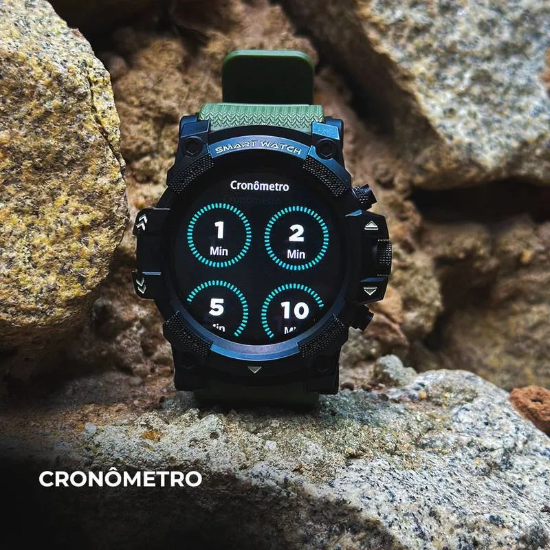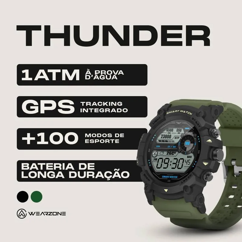 Impactante como um trovão, WEARZONE THUNDER redefine o sinônimo de força e coragem com seu designer ultra Robusto, contando com GPS integrado e um novo sistema tracking que mostra o percurso assim que a sua corrida ou caminhada e finalizada no smartwatch, resistência contra água de até 10 metros, mais de 100 modos de esporte se torna ideal para os aventureiros.